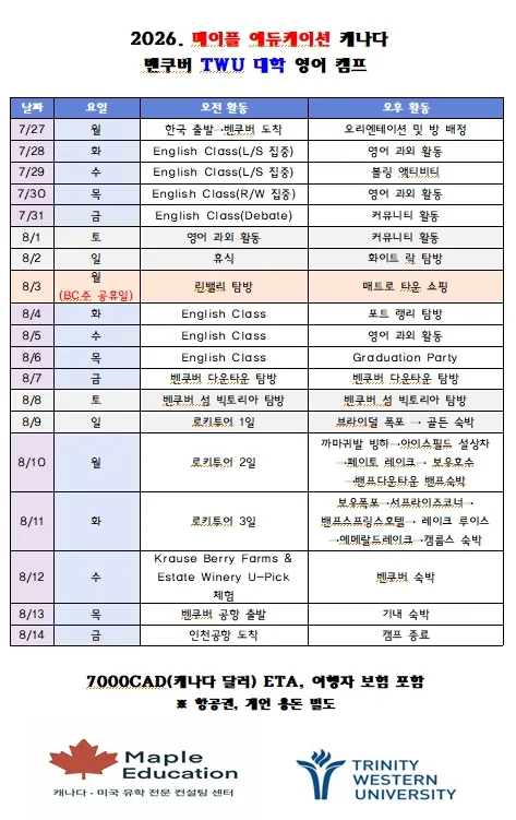 글로벌 리더를 꿈꾸는 아이들을 위한 최고의 선택! 메이플 에듀케이션과 캐나다 명문 TWU(Trinity Western University) 대학이 협력하여, 단순한 어학연수를 넘어 아이의 인생에 전환점이 될 3주간의 특별한 여정을 선물합니다.